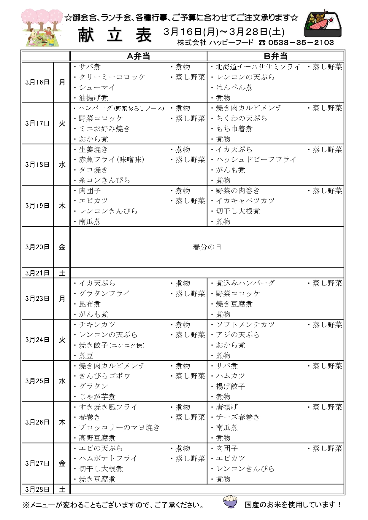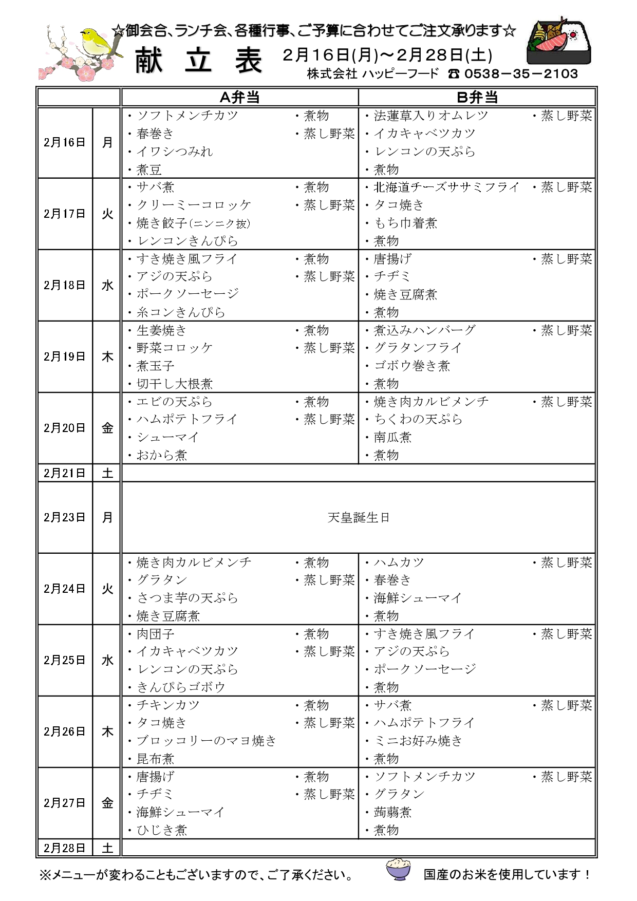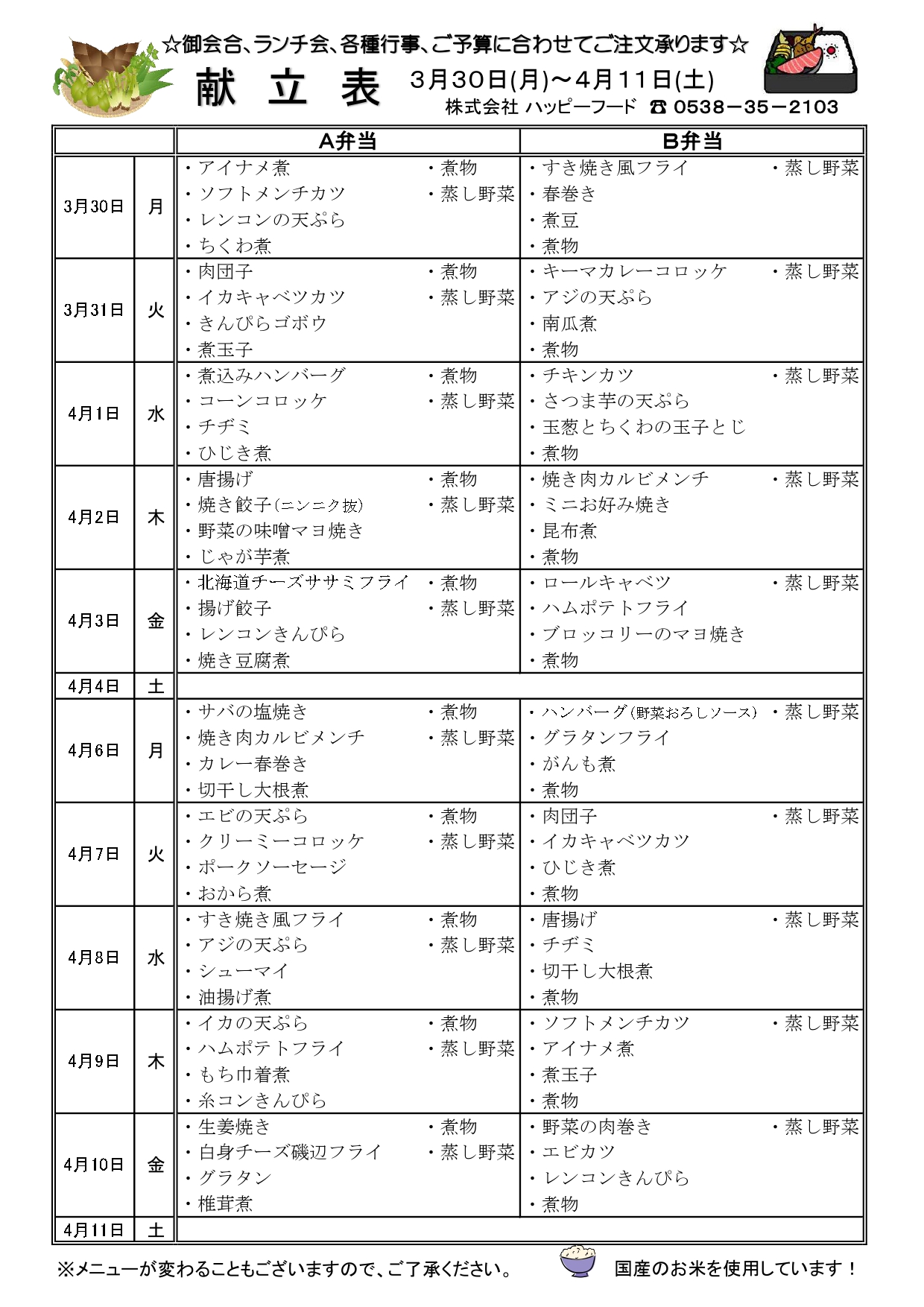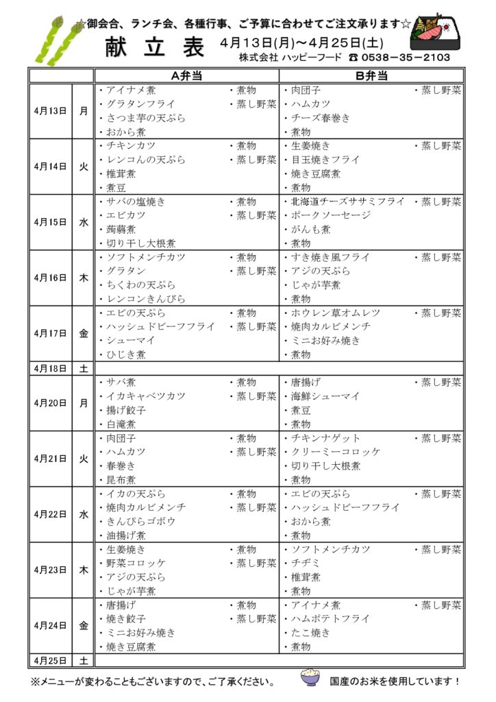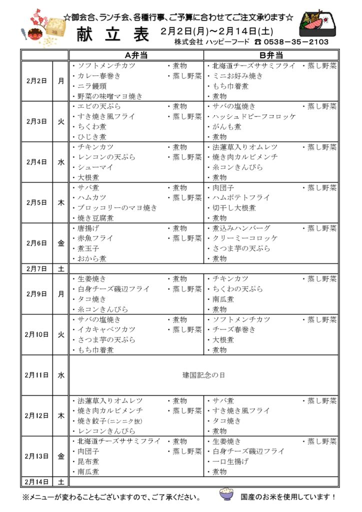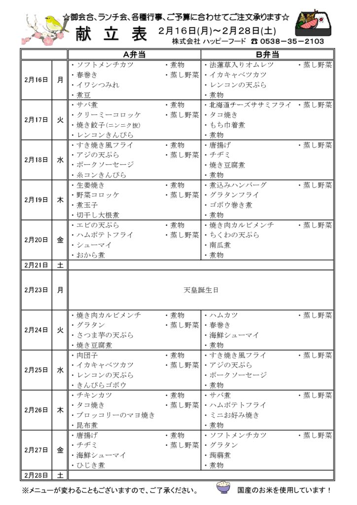 日替わりA・B弁当メニュー
